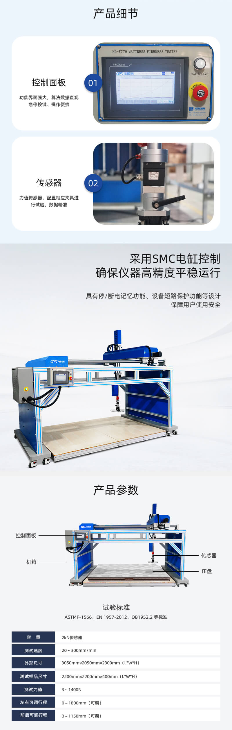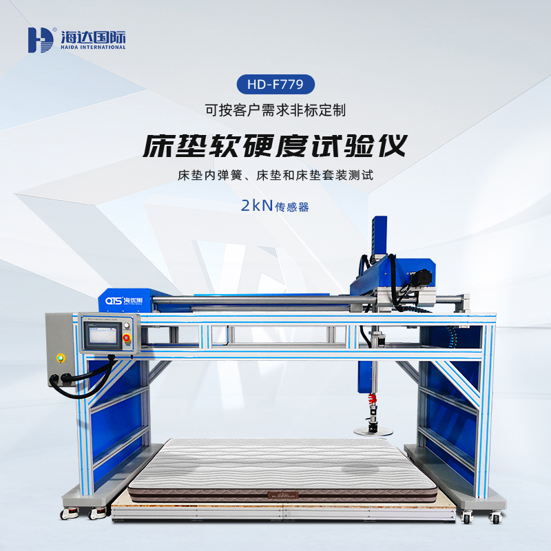 床墊軟硬度試驗儀適用于不同床墊的軟硬度測試,在床墊不同位置加載一定載荷,比較不同床墊的加載曲線線性及相同加載點的力值偏差,從而判定床墊軟硬度及硬度等級,提高產品的品質。