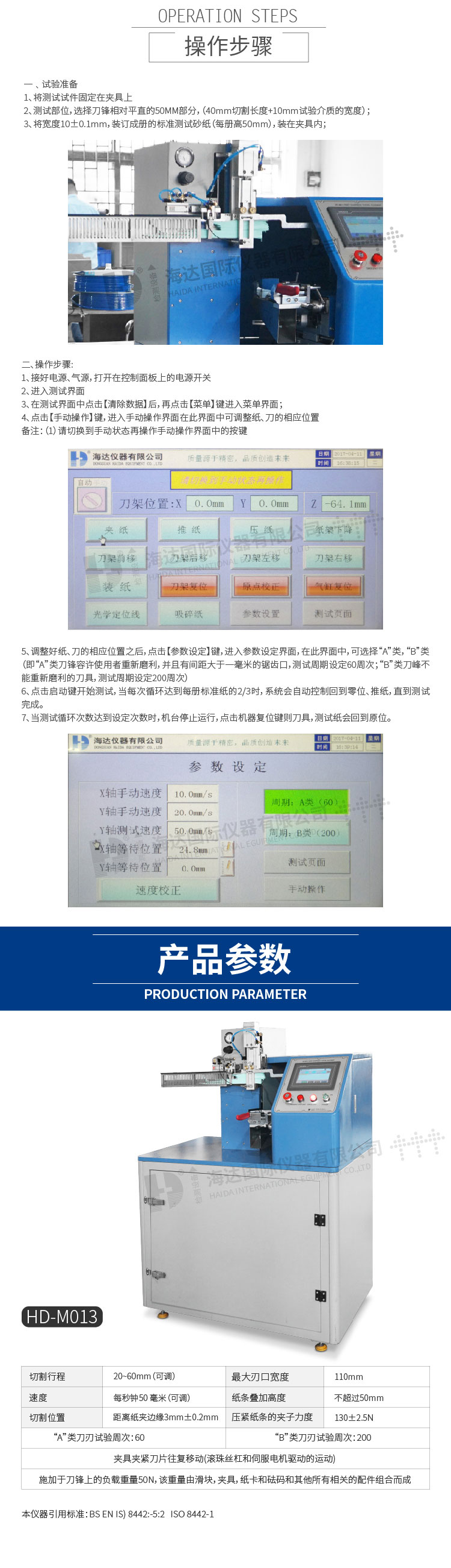 HD-M013刀鋒銳利度測試儀,測試刀具的鋒利度值,PLC微電腦程序控制,操作簡單,穩(wěn)定準確,LCD觸摸屏,操作界面友好,使用簡便,具有割點自動定位、刀具自動復位切割功能,實時顯示刀具切斷測試材料所需的力值及切斷力曲線。