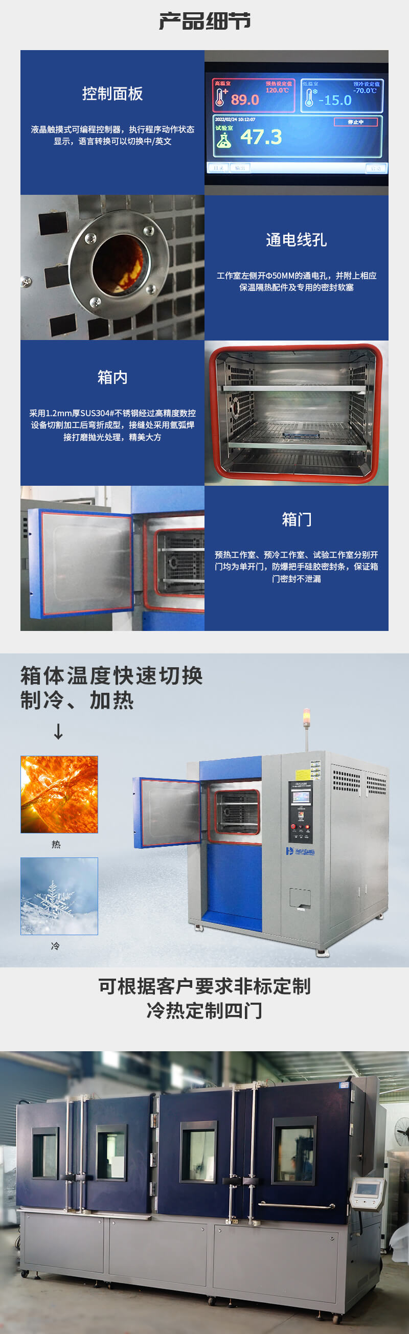 預(yù)熱工作室、預(yù)冷工作室、常溫沖擊室、試驗(yàn)工作室間采用加厚保溫層斷熱,接口處采用耐高溫環(huán)氧樹(shù)脂板斷熱,有效防止熱量互串達(dá)到節(jié)能的目的;同時(shí)預(yù)熱工作室、預(yù)冷工作室、試驗(yàn)工作室箱門內(nèi)板均采用環(huán)氧樹(shù)脂板進(jìn)行斷熱,有效防止熱量傳到設(shè)備外表影響設(shè)備安裝控件溫度,安全可靠。 |