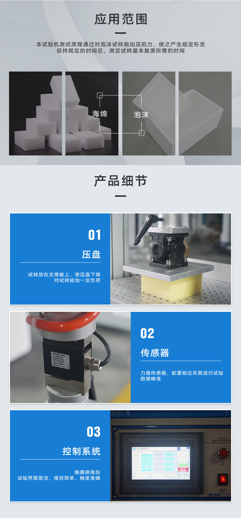 海綿壓陷回復時間試驗儀測試原理是對泡沫試樣施加壓陷力,使之產生規定形變,保持規定的時間后,測定試樣基本復原所需的時間。