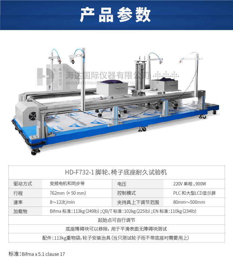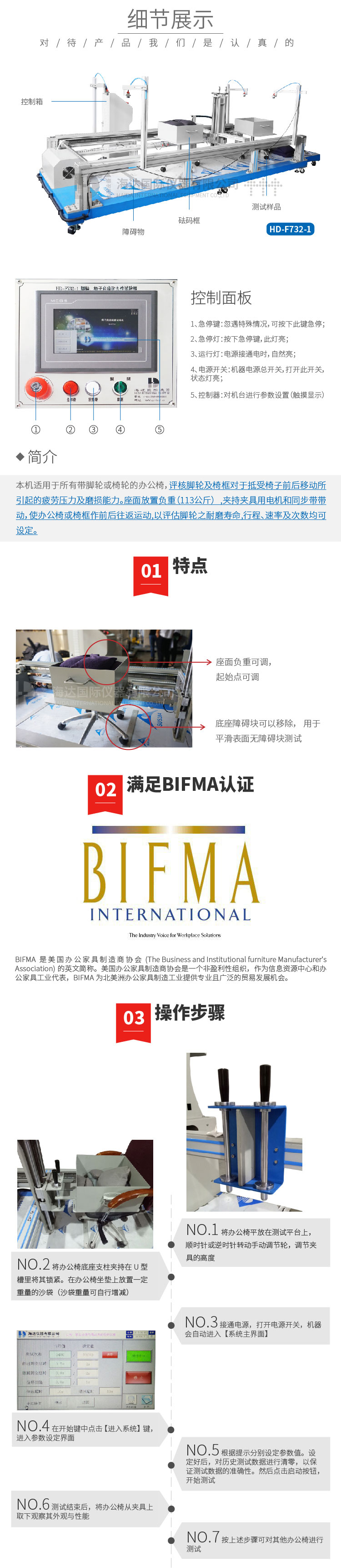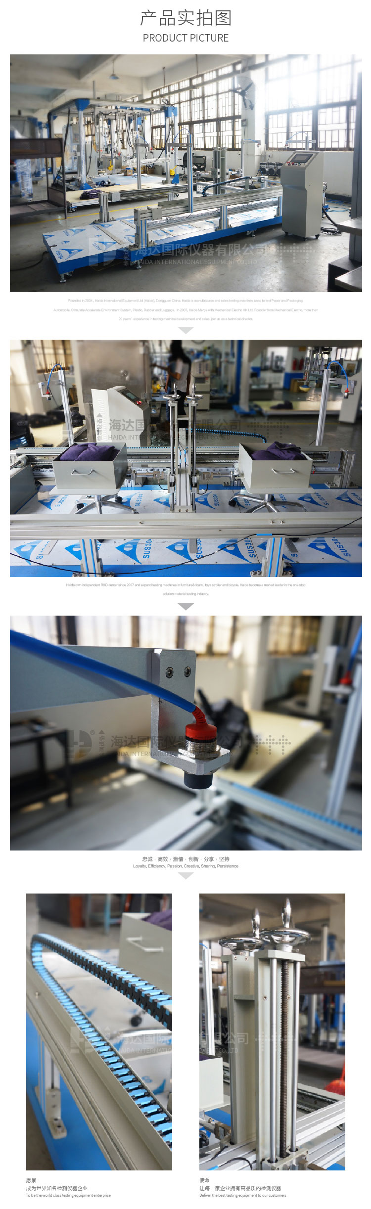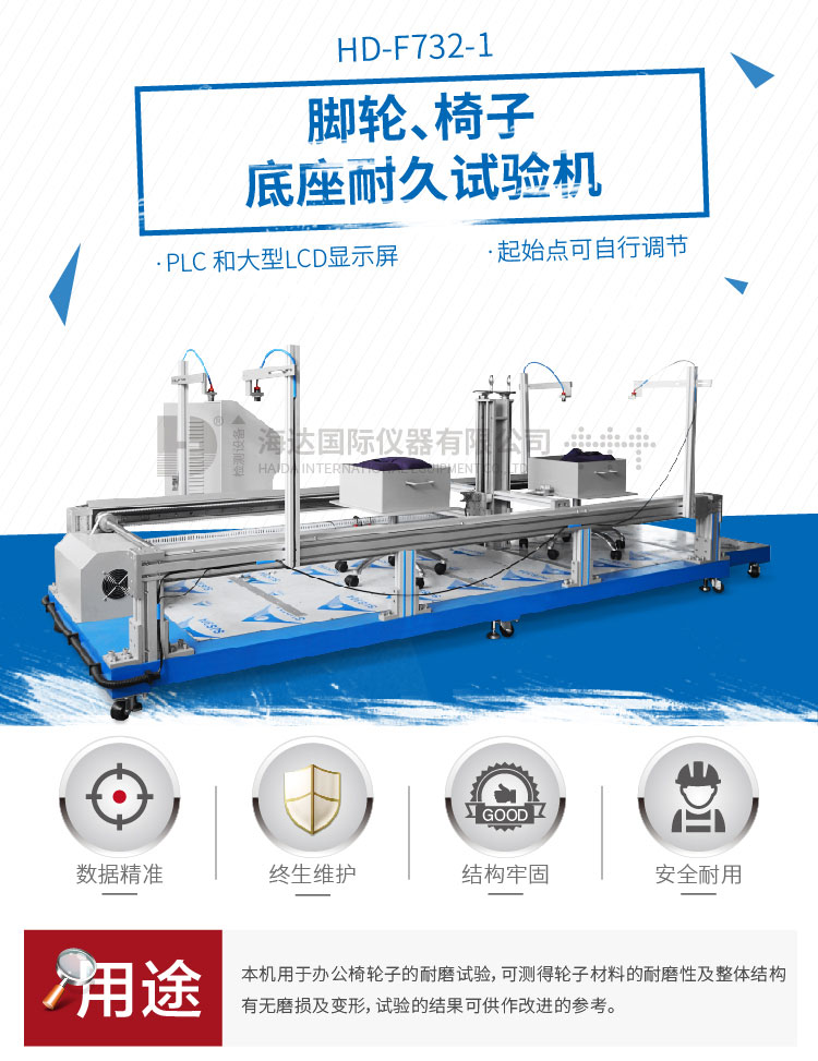 辦公椅輪子耐磨試驗儀適用于所有底座配備萬向輪的椅子。用于評估辦公椅腳輪在負載狀態下移動的耐久能力。分有障礙和無障礙兩種測試方式,有障礙測試指辦公椅座面放置負荷,施力循環裝置,作左右往復推拉動作,行程及時間、次數均可設定。