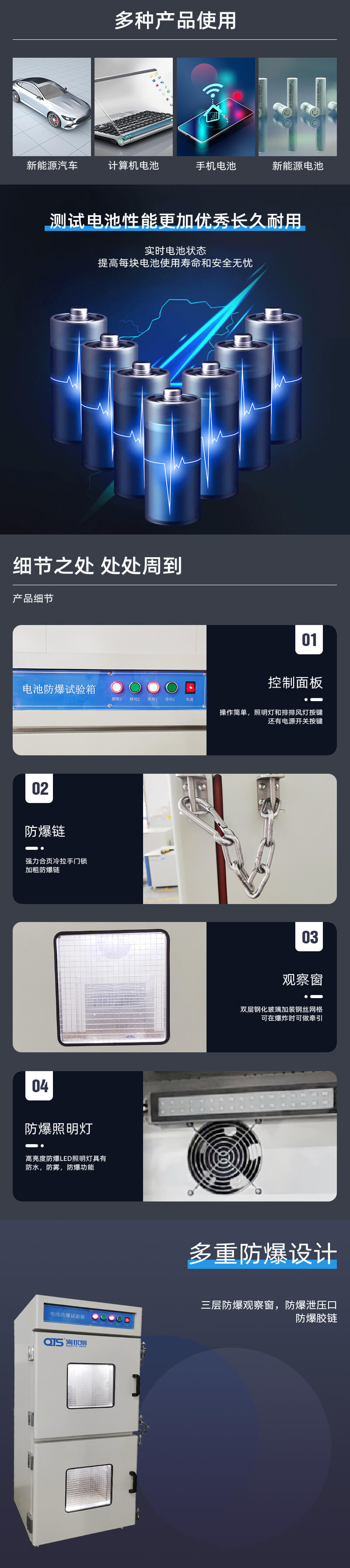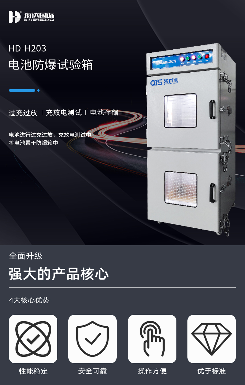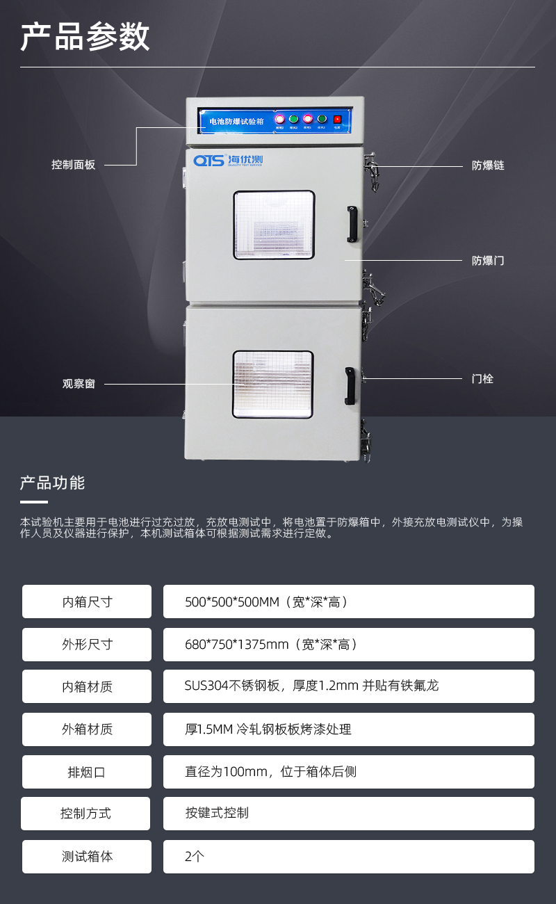 電池防爆試驗箱主要用于電池進行過充過放,充放電測試中,將電池置于防爆箱中,外接充放電測試儀中,為操作人員及儀器進行保護,本機測試箱體可根據(jù)測試需求進行定做。